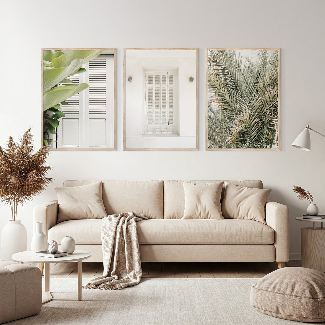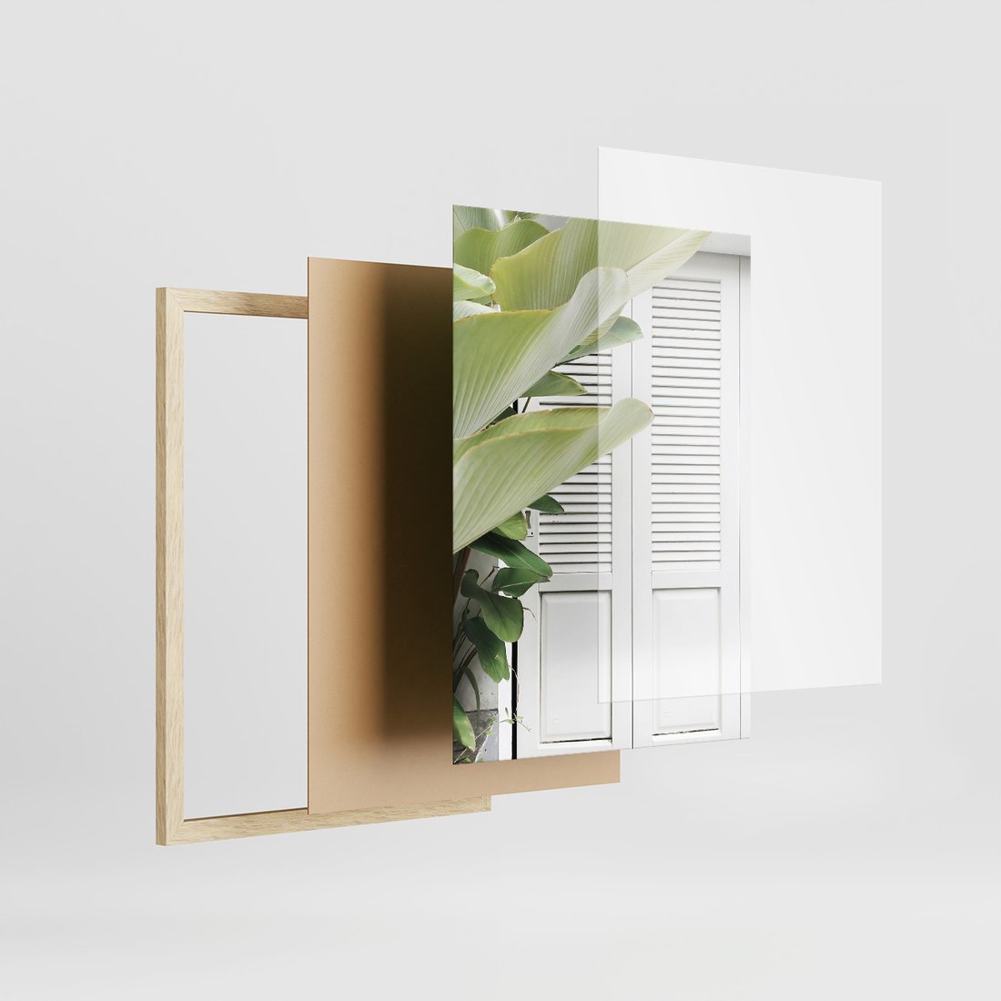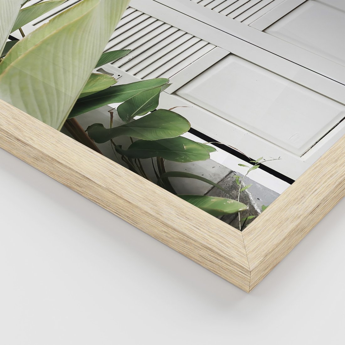 Zestaw obrazy w ramie, plakaty - liście, okno, ściana - rama drewno