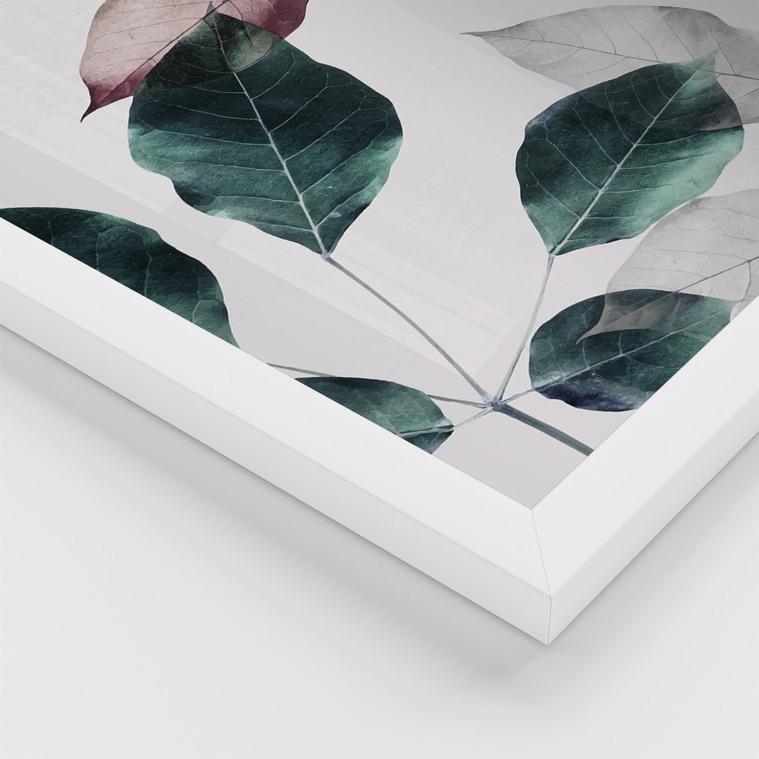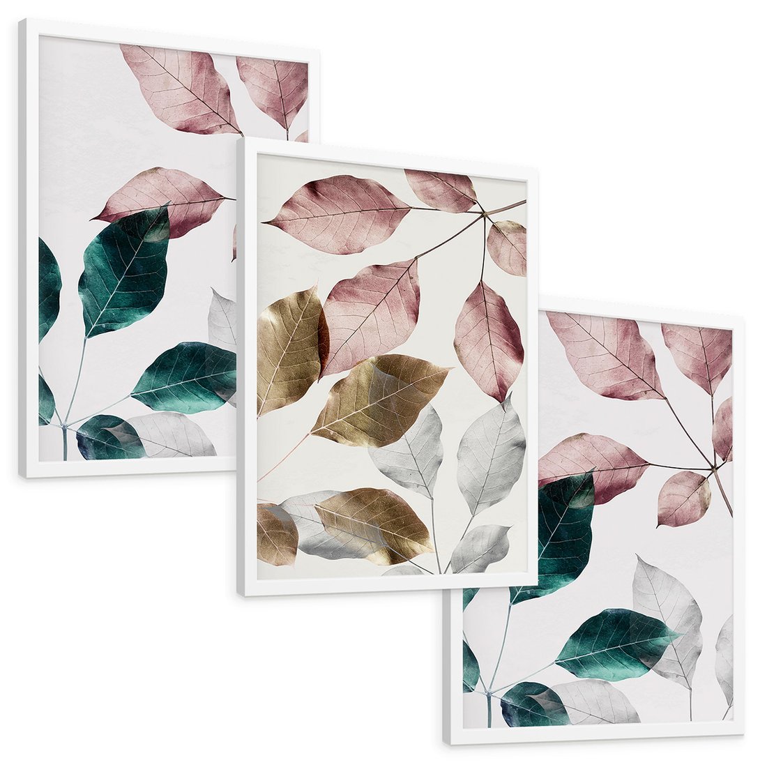 Zestaw obrazy w ramie, plakaty - liście, pastelowe, botaniczne - rama biała