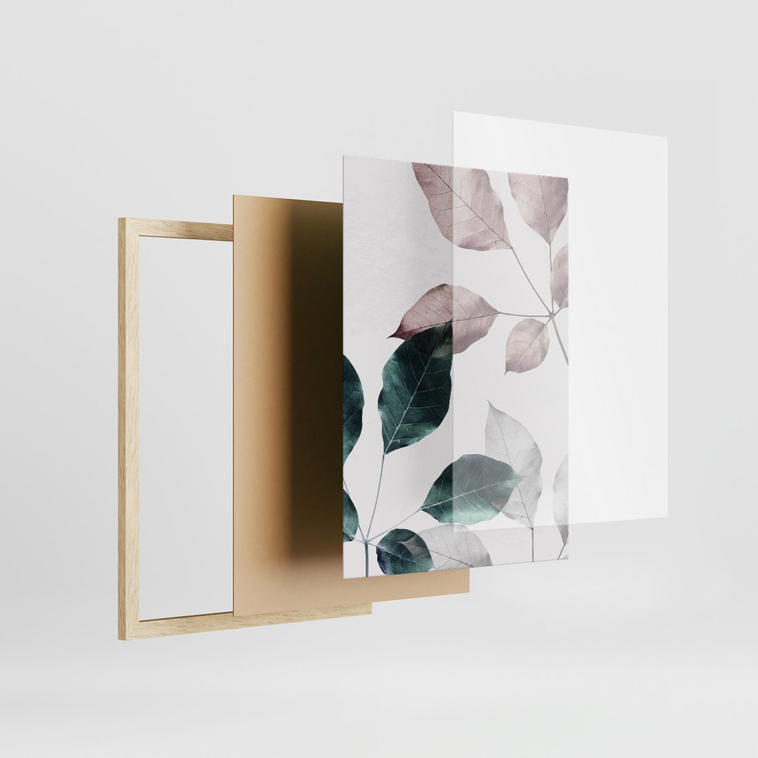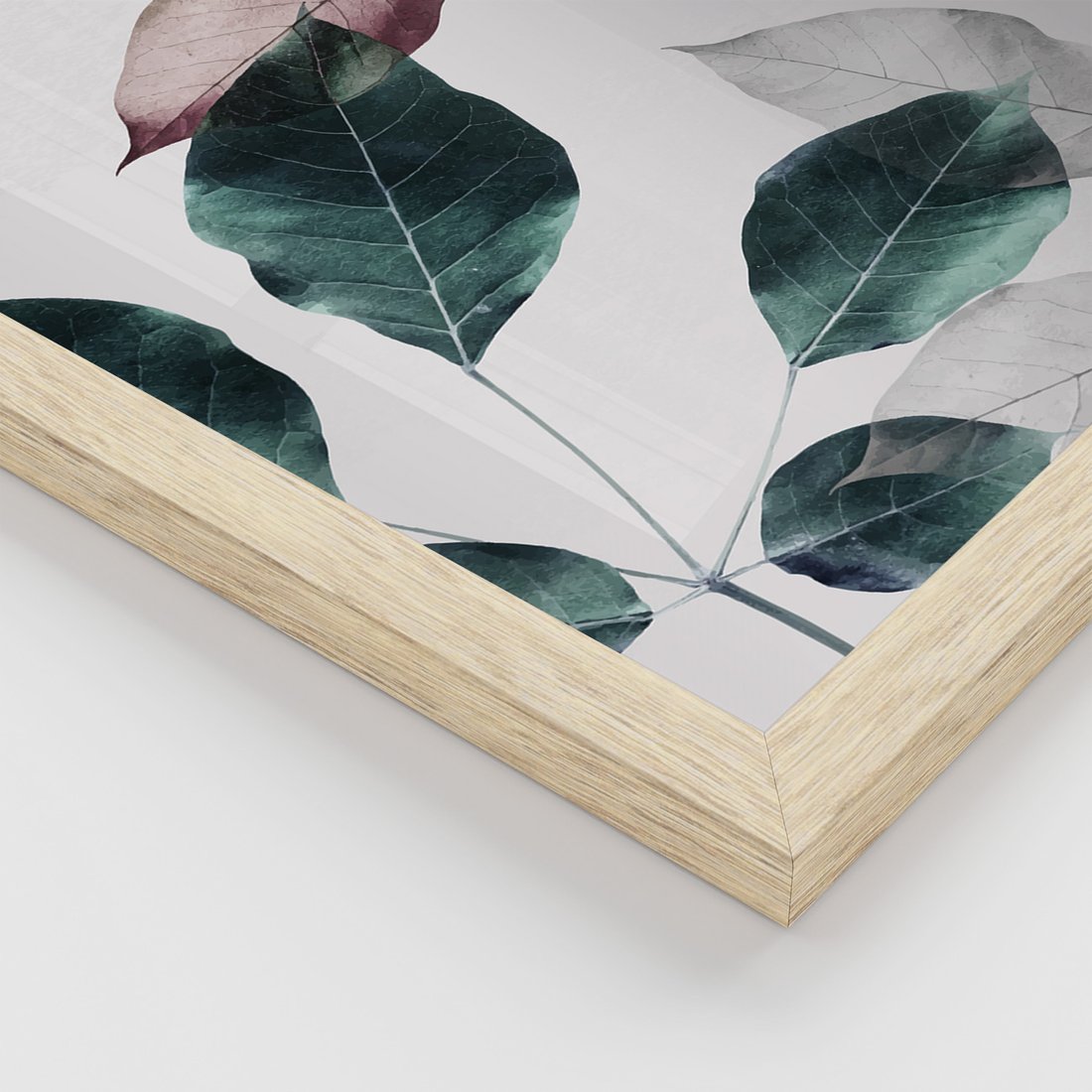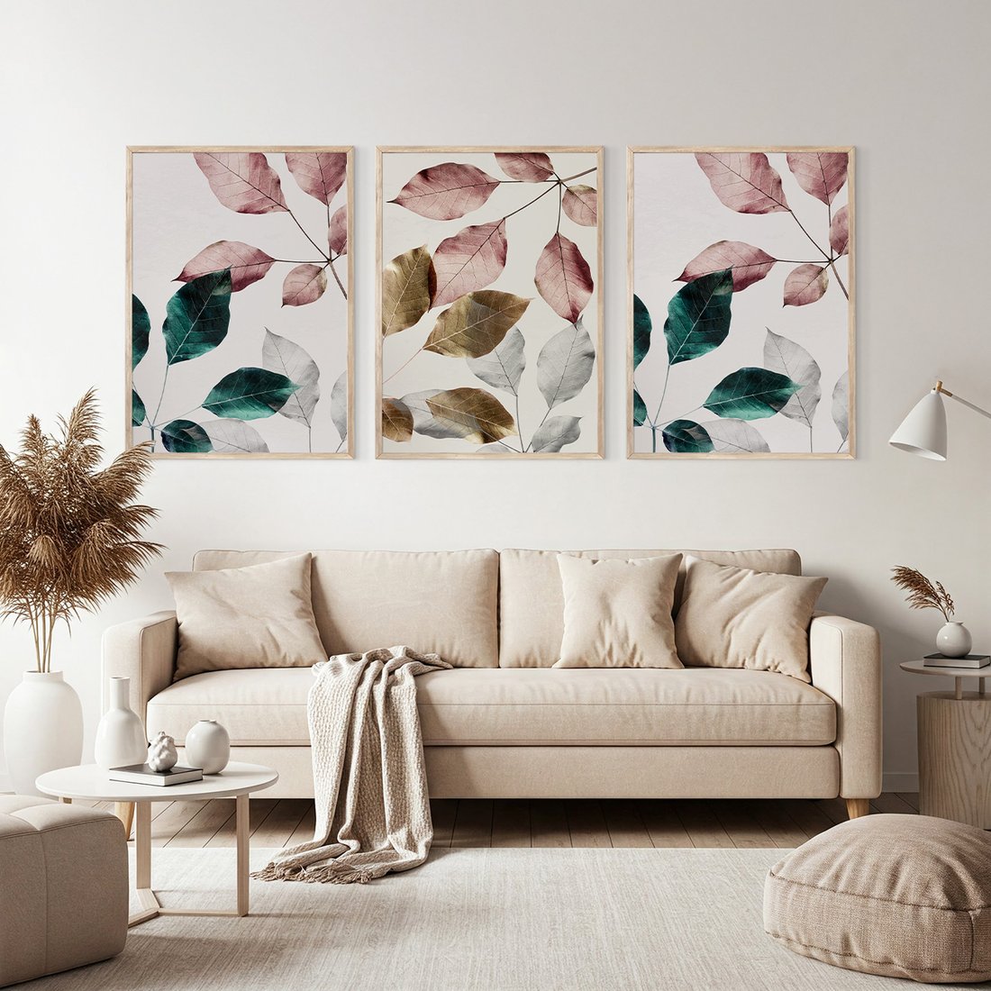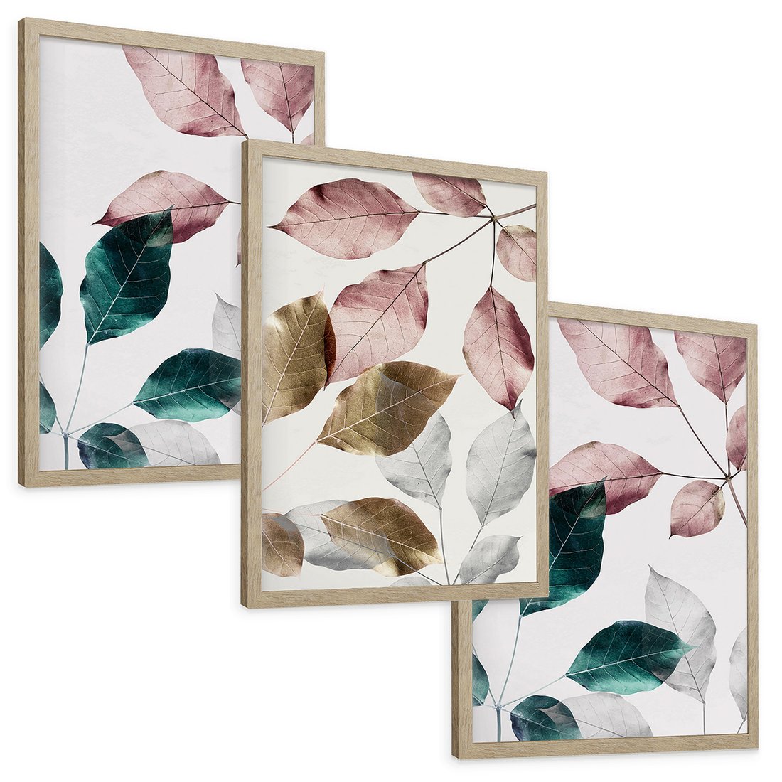 Zestaw obrazy w ramie, plakaty - liście, pastelowe, botaniczne - rama drewno