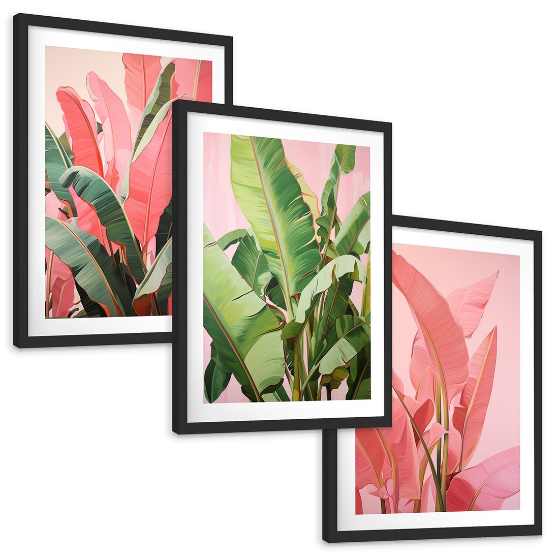 Zestaw obrazy w ramie, plakaty - liście, pastelowy, tropikalny - rama czarna