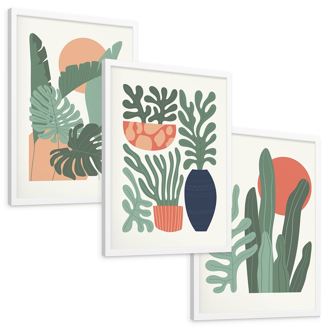 Zestaw obrazy w ramie, plakaty - liście, rośliny, abstrakcja - rama biała