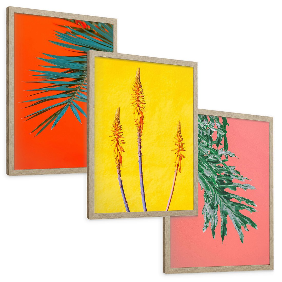 Zestaw obrazy w ramie, plakaty - liście, rośliny, kolory - rama drewno