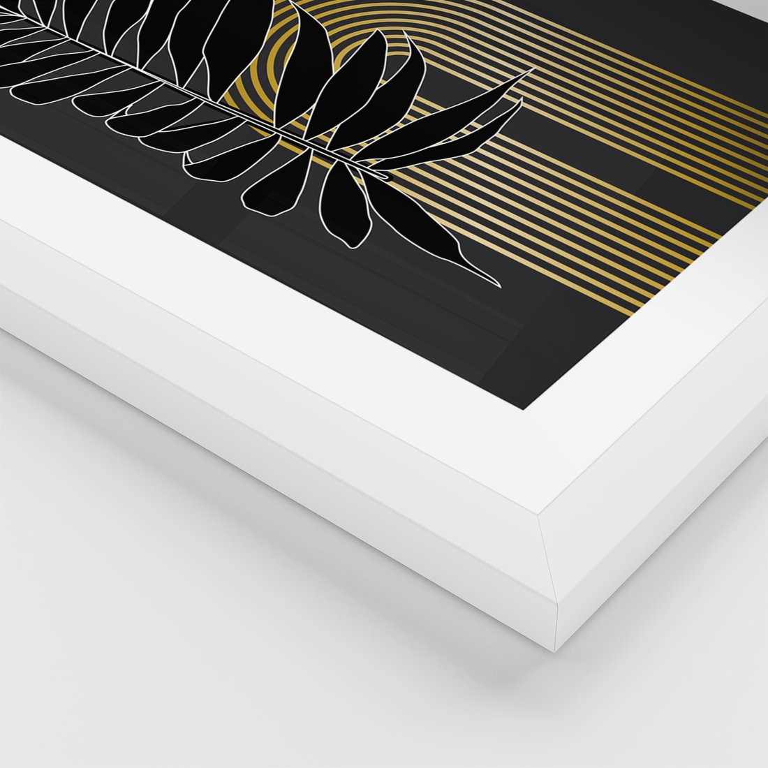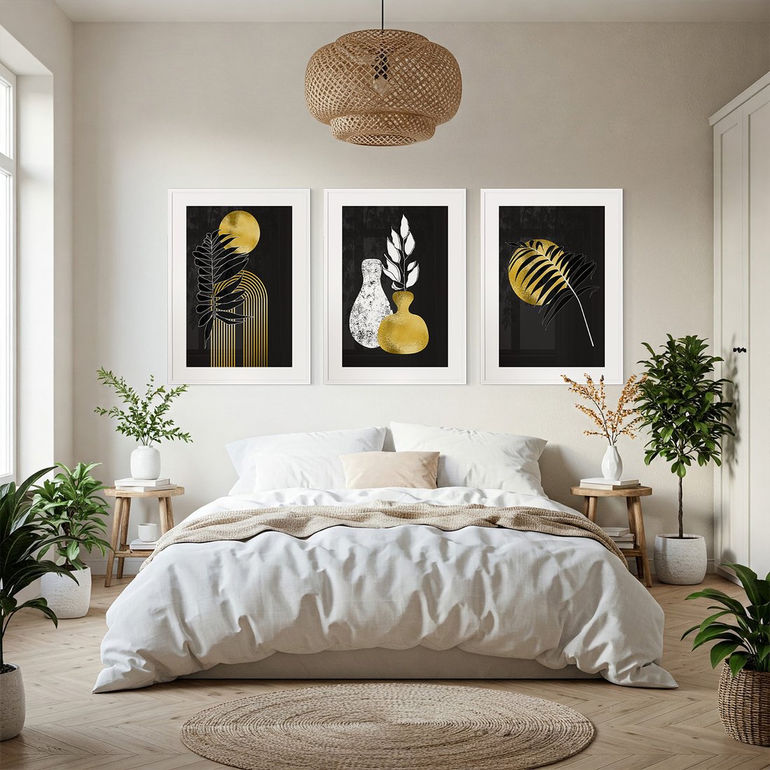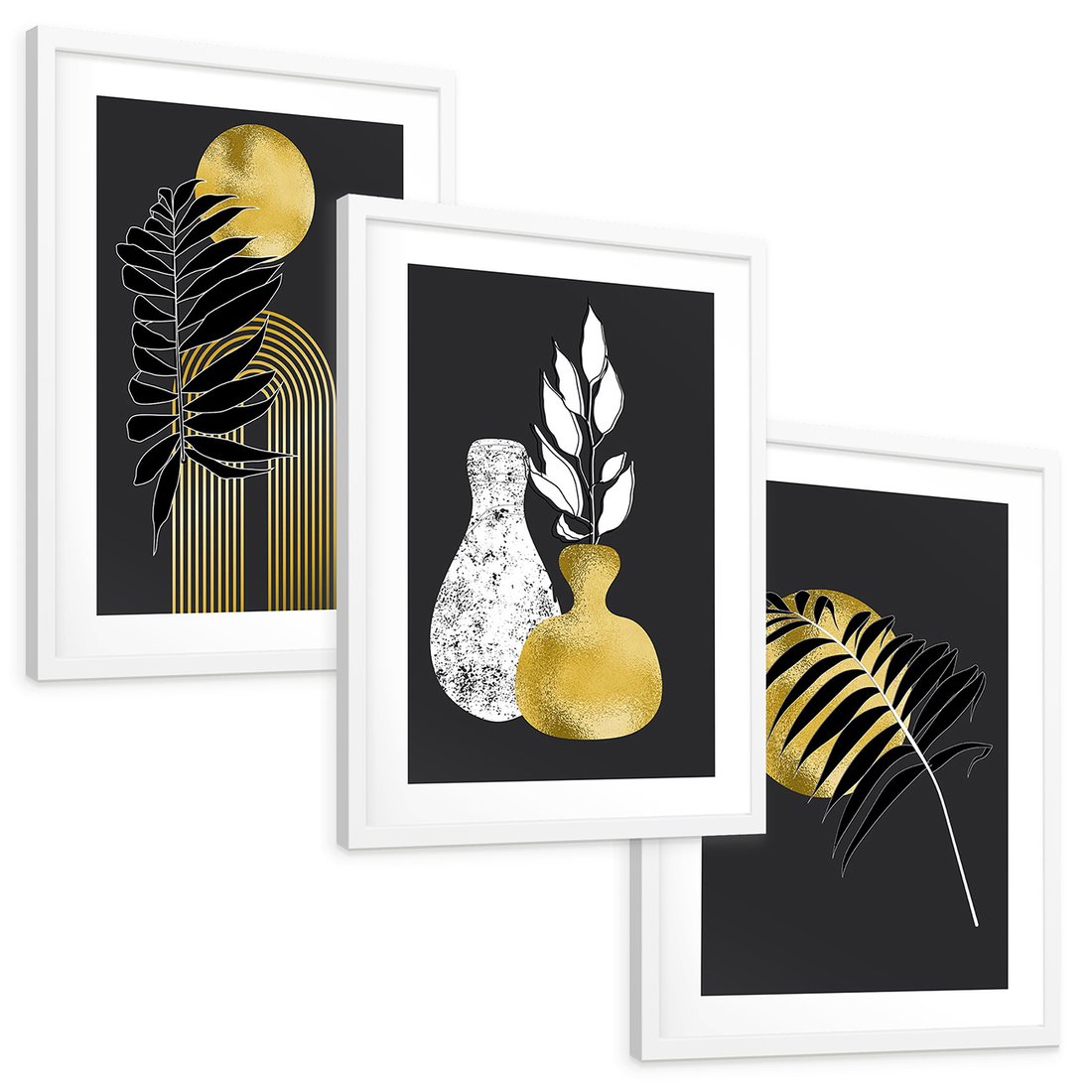 Zestaw obrazy w ramie, plakaty - liście, złoto, abstrakcja - rama biała