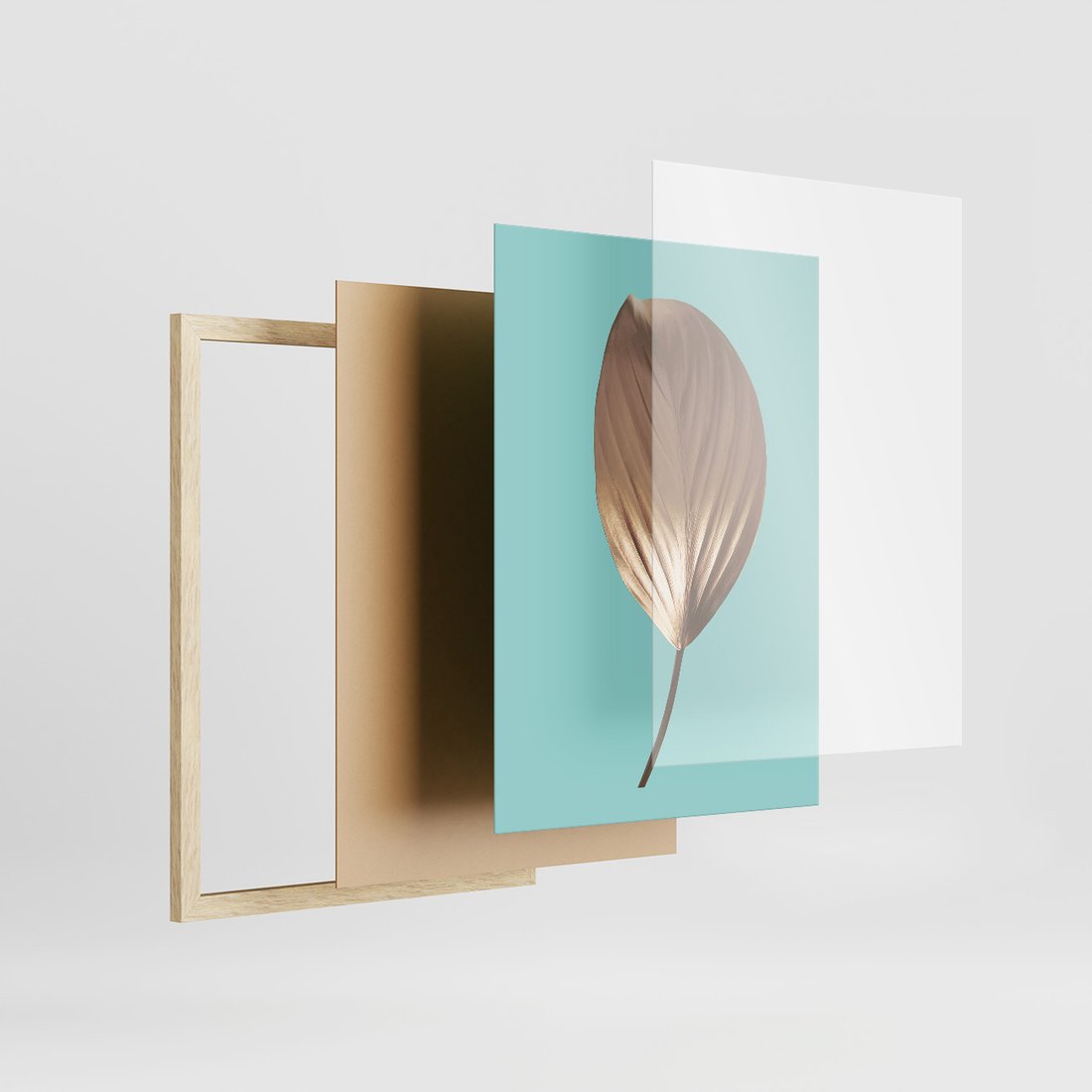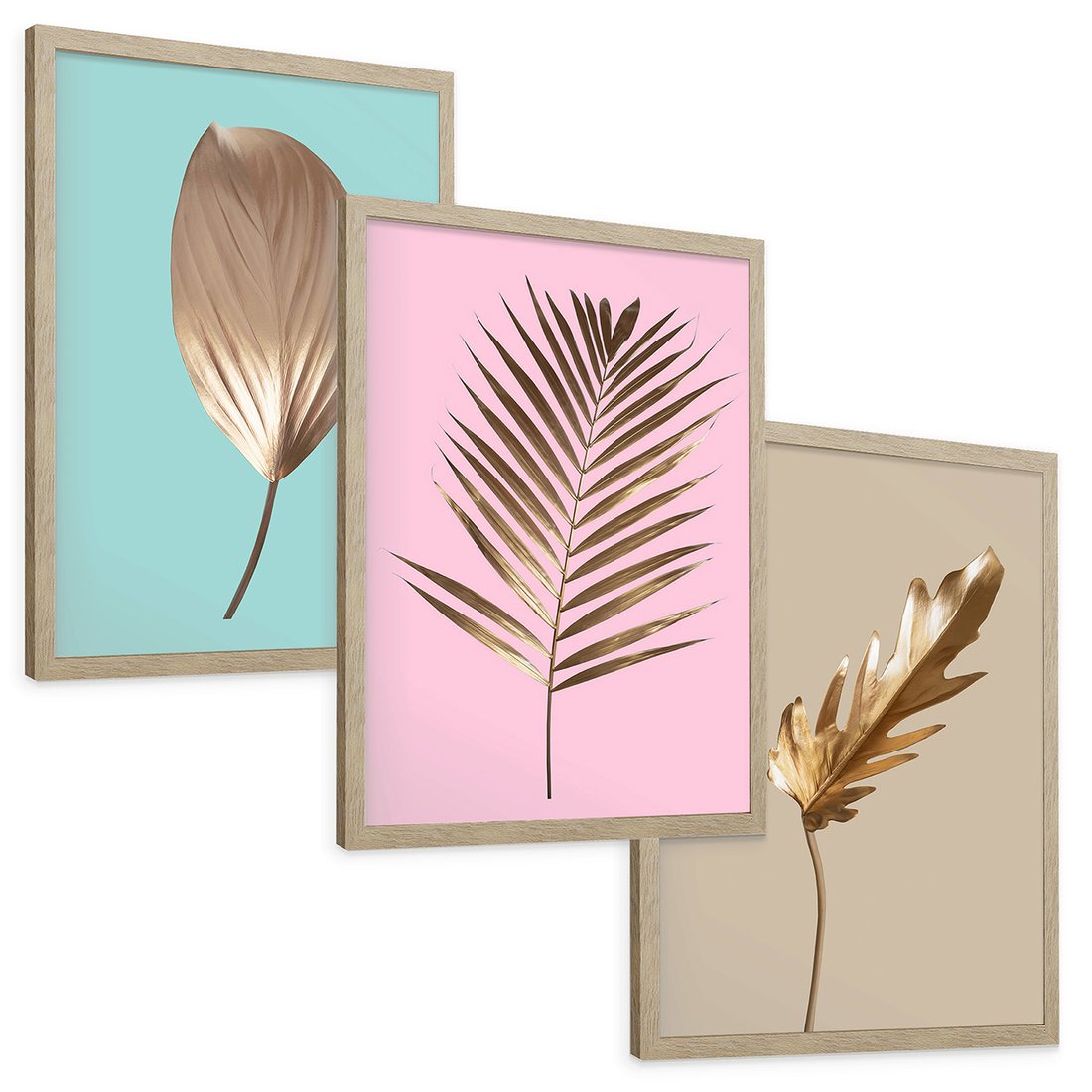 Zestaw obrazy w ramie, plakaty - liście, złoto, roślina - rama drewno