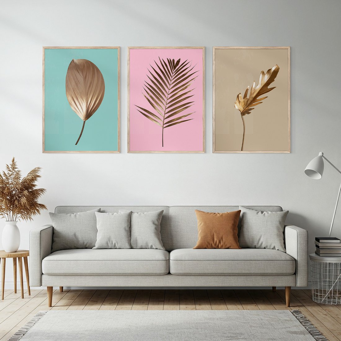 - Zestaw obrazy w ramie, plakaty - liście, złoto, roślina
