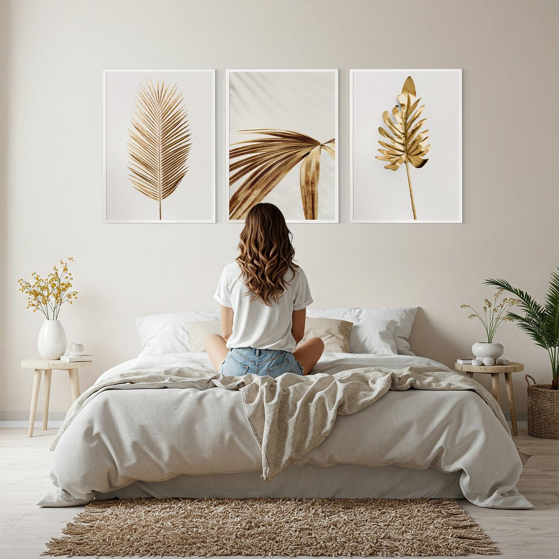 • Zestaw obrazy w ramie, plakaty - liście, złoty, dekoracja