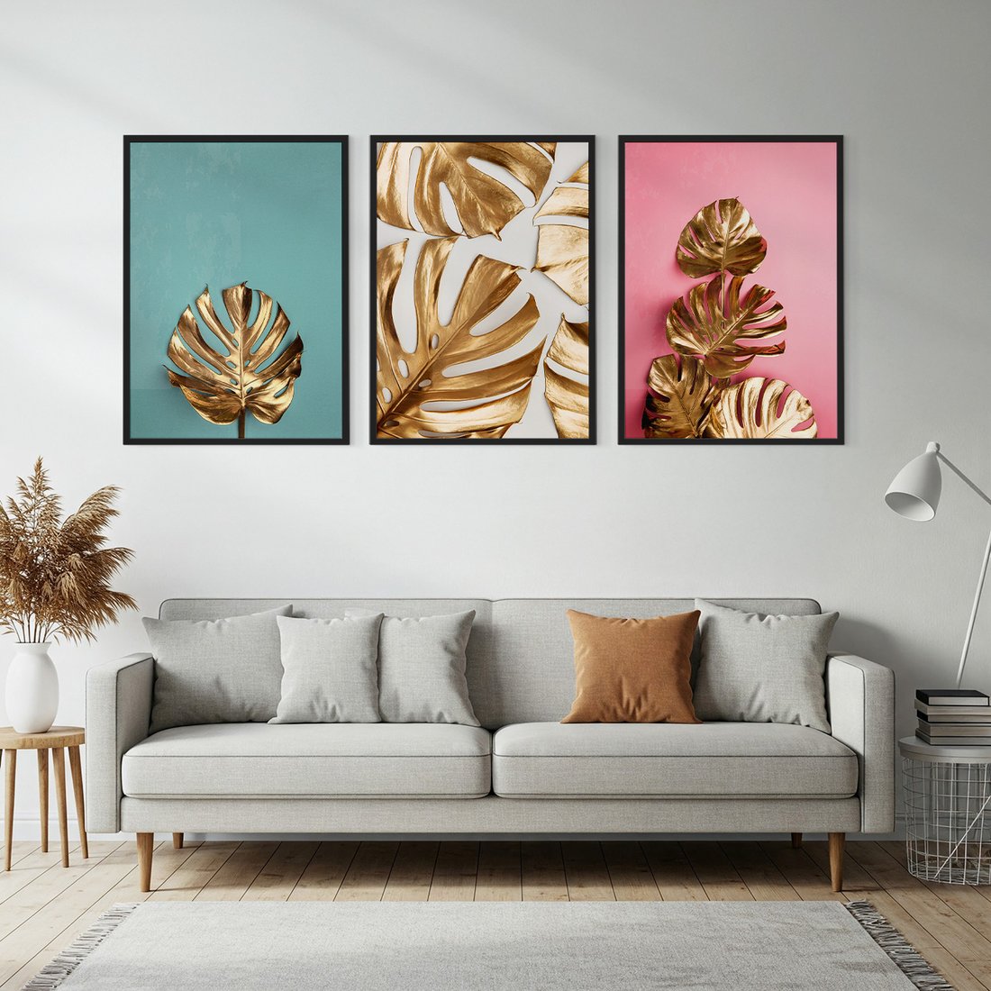 • Zestaw obrazy w ramie, plakaty - liście, złoty, monstera