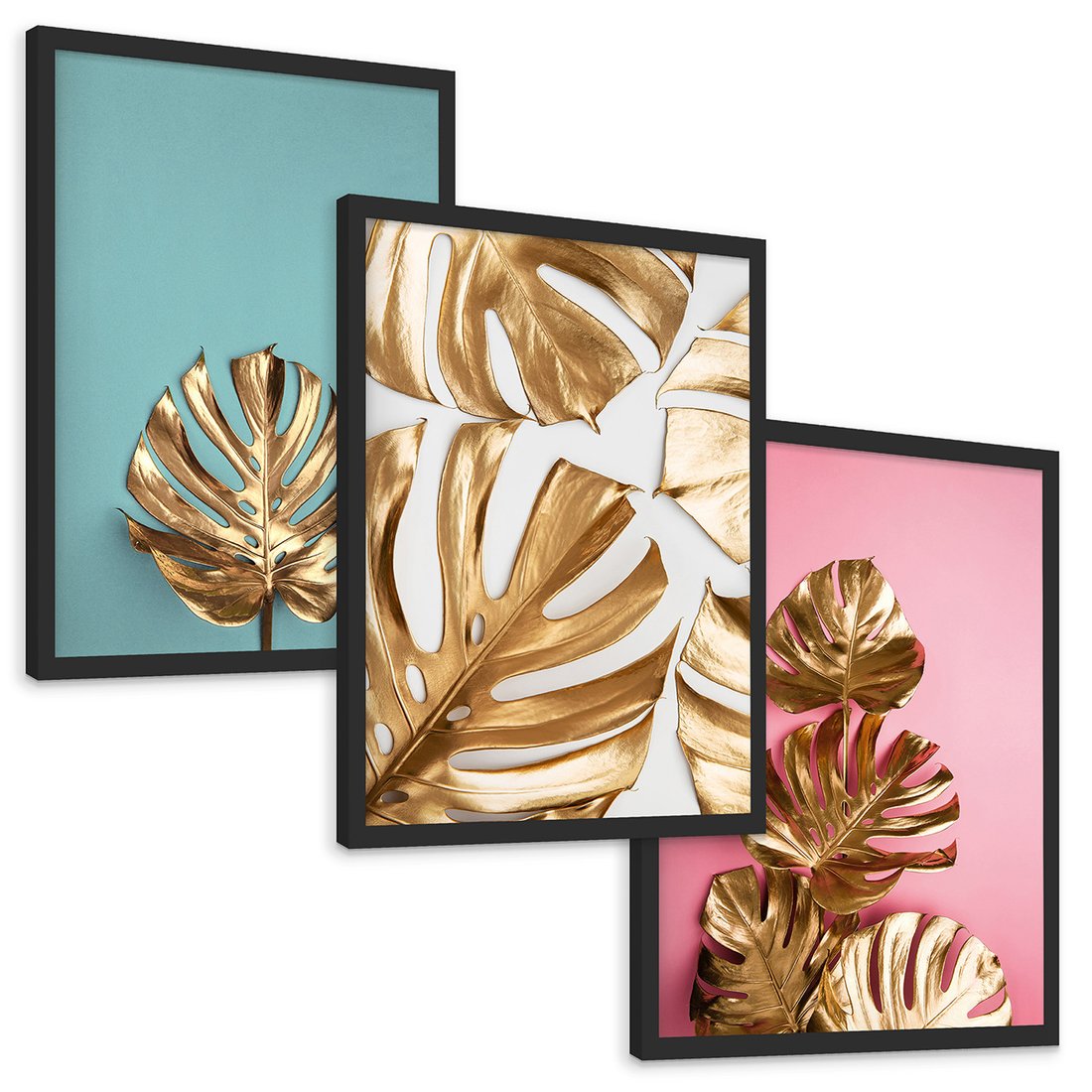 Zestaw obrazy w ramie, plakaty - liście, złoty, monstera - rama czarna