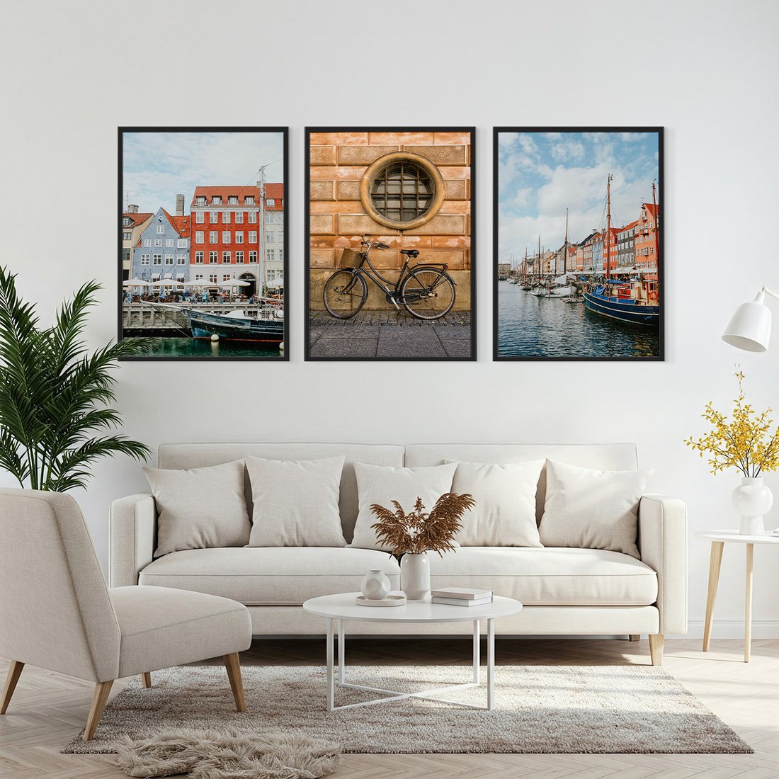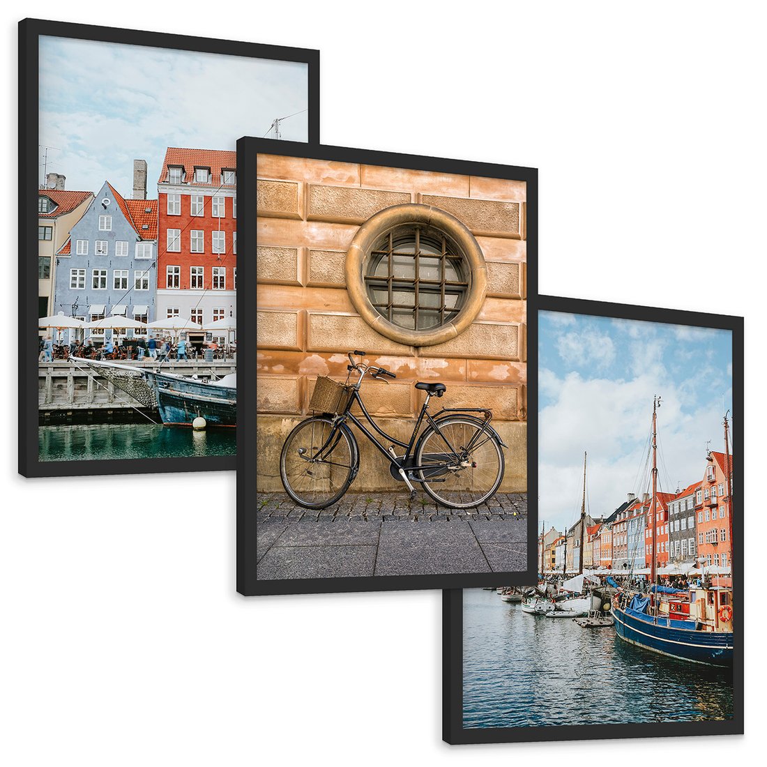 Zestaw obrazy w ramie, plakaty - miasto, budynki, kanał - rama czarna