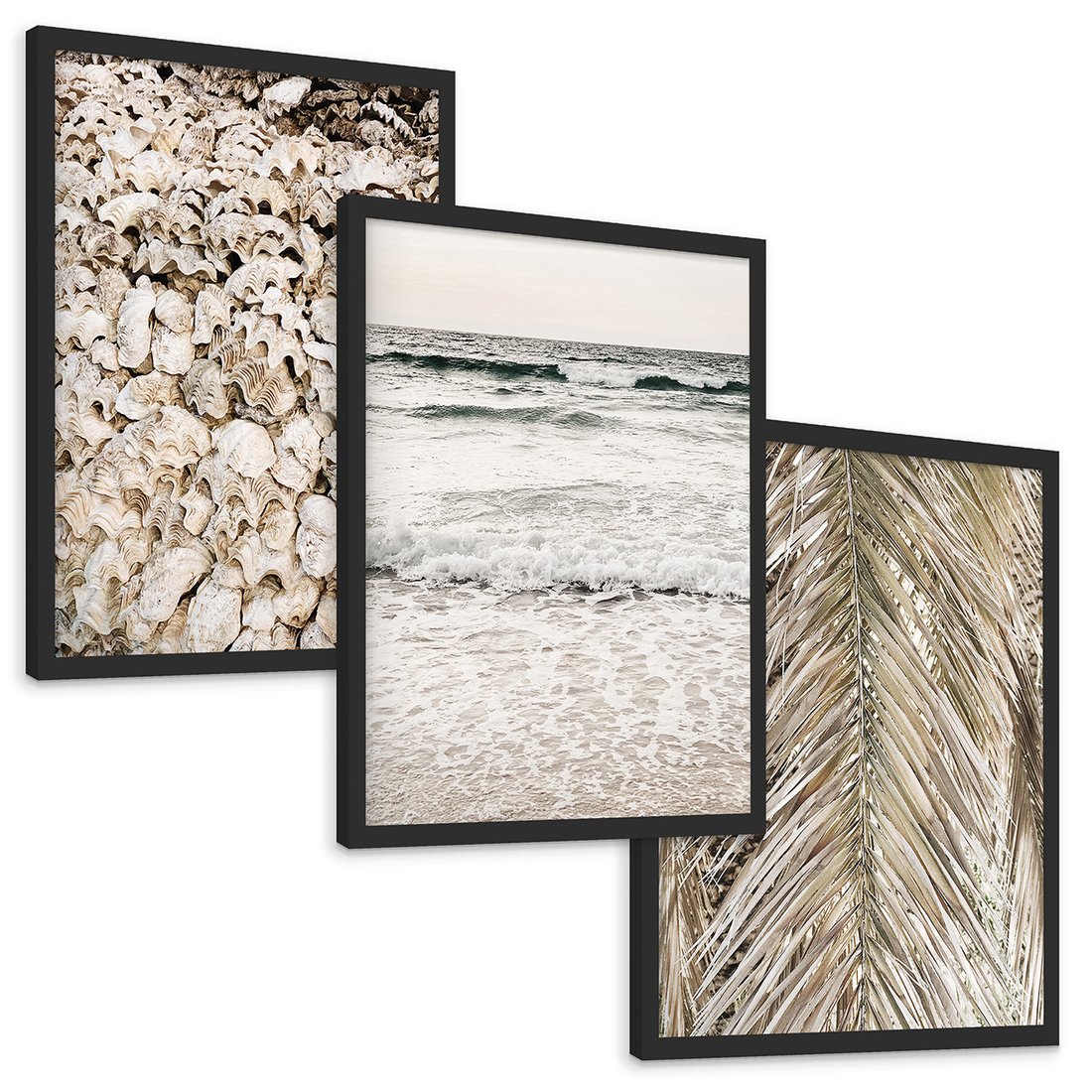 Zestaw obrazy w ramie, plakaty - muszle, morze, liście - rama czarna