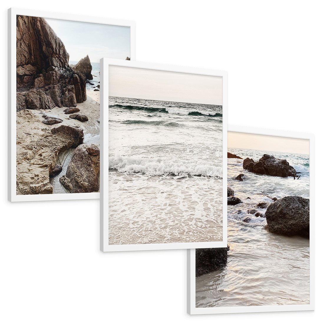 Zestaw obrazy w ramie, plakaty - plaża, morze, skały - rama biała