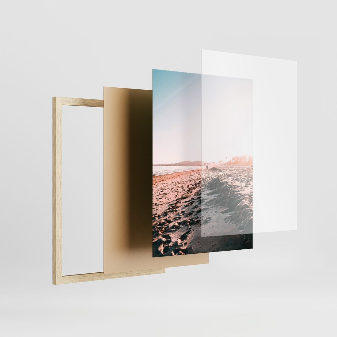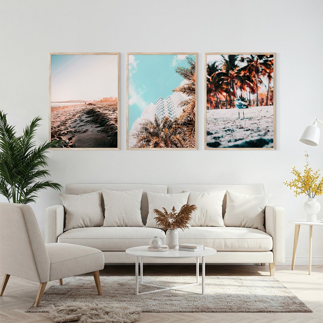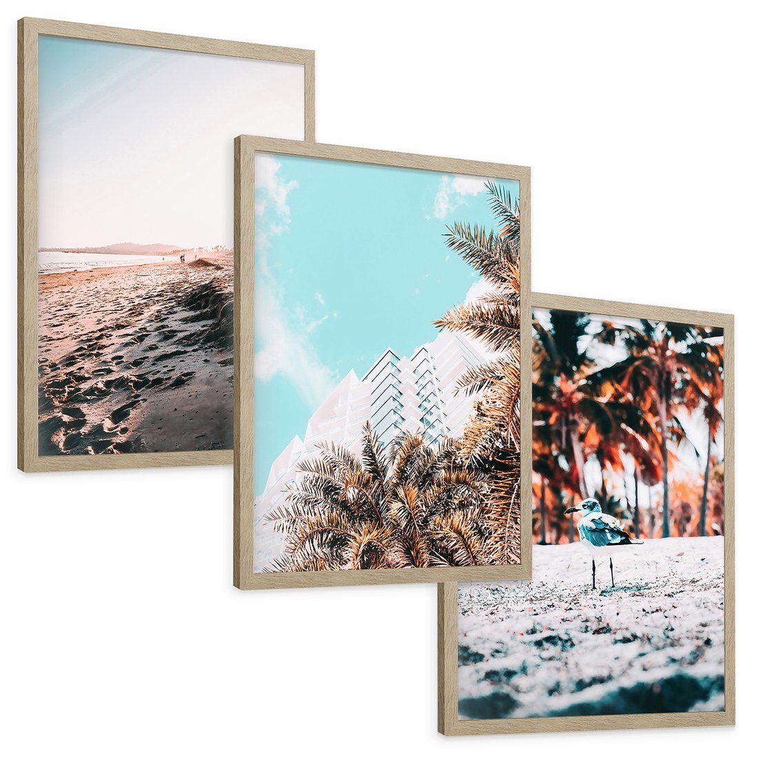 Zestaw obrazy w ramie, plakaty - plaża, palmy, budynek - rama drewno