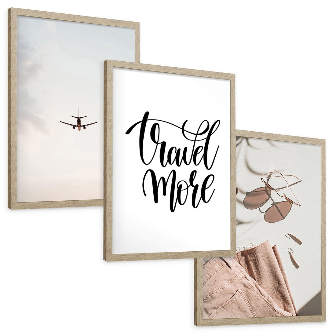 Zestaw obrazy w ramie, plakaty - podróże,wakacje,samolot - rama drewno