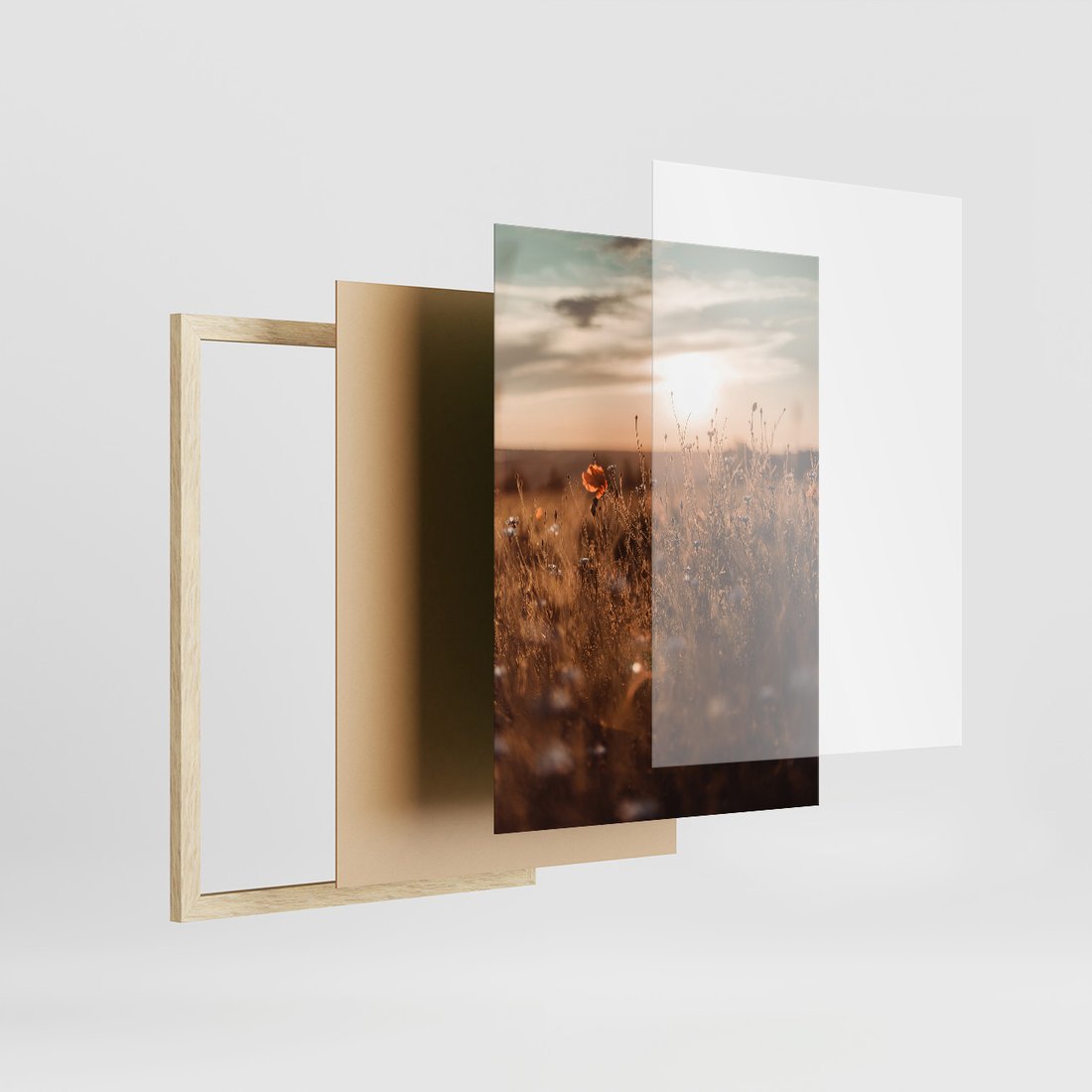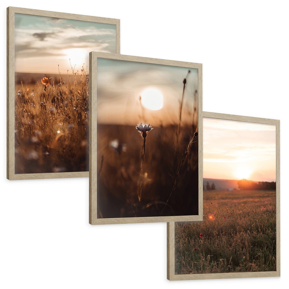 Zestaw obrazy w ramie, plakaty - pole, kwiaty, słońce - rama drewno