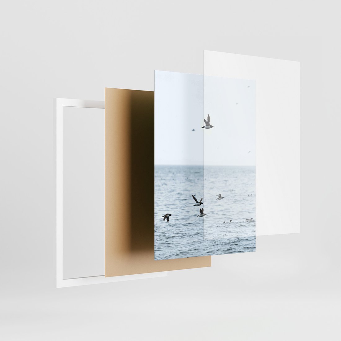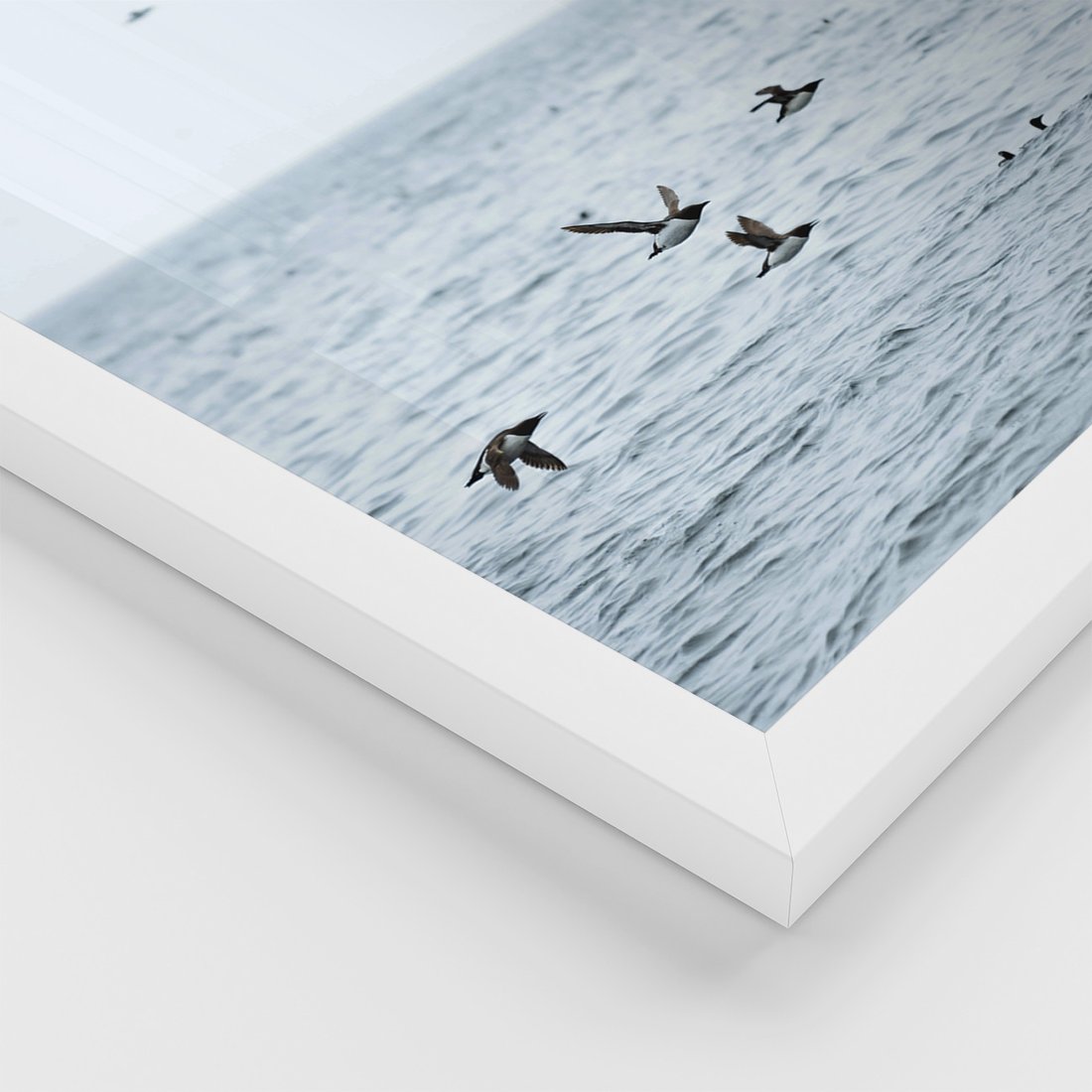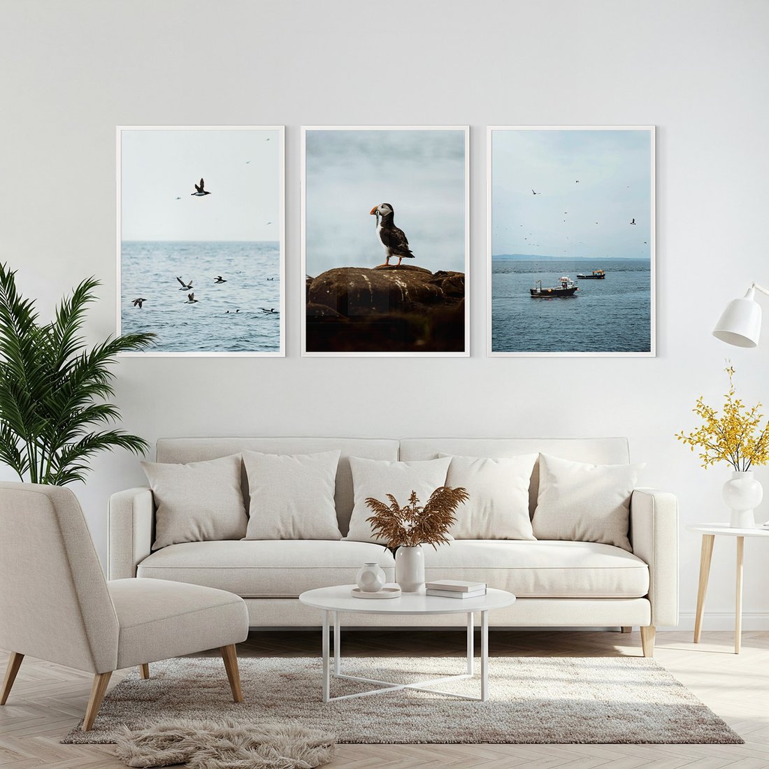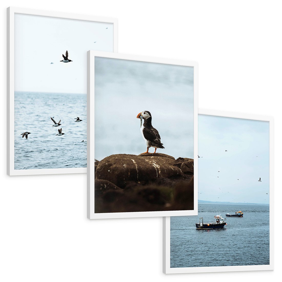 Zestaw obrazy w ramie, plakaty - ptaki, morze, łodzie - rama biała