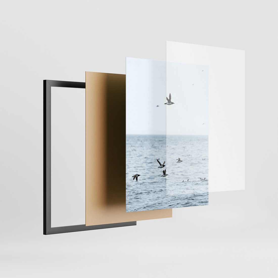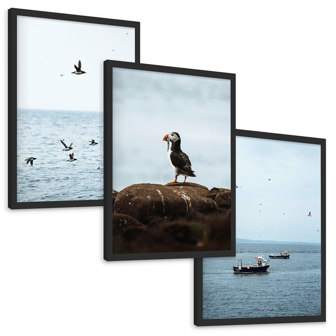 Zestaw obrazy w ramie, plakaty - ptaki, morze, łodzie - rama czarna