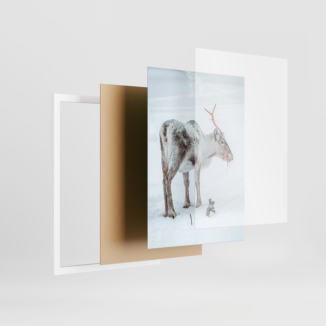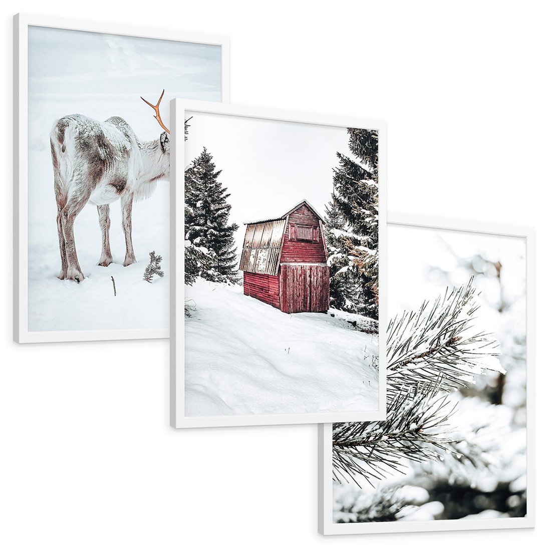 Zestaw obrazy w ramie, plakaty - renifer, śnieg, zima - rama biała