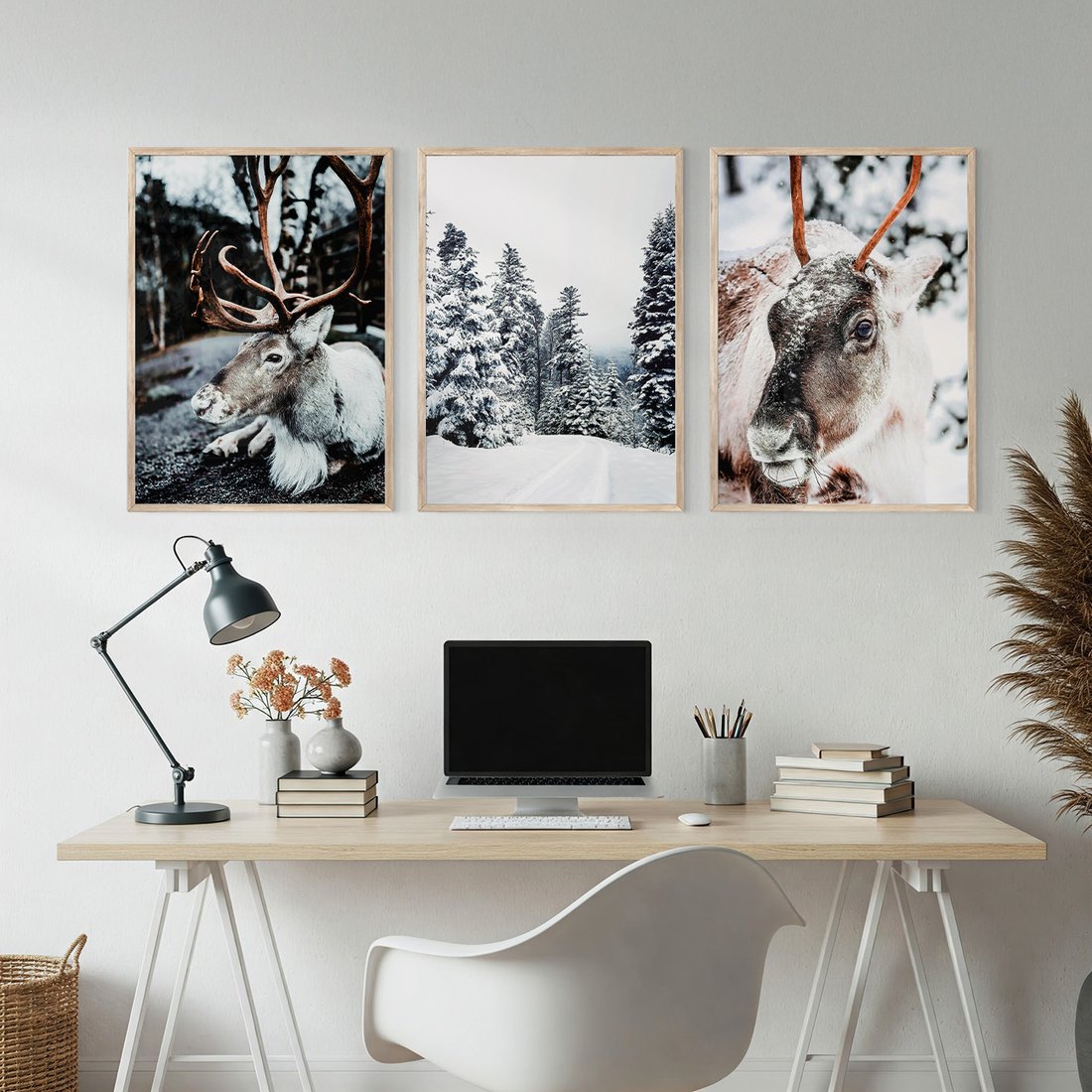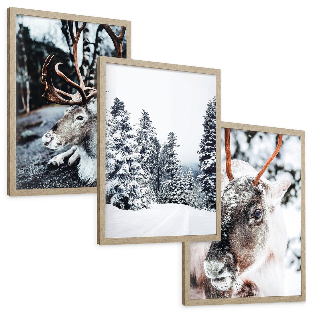 Zestaw obrazy w ramie, plakaty - renifer, zima, śnieg - rama drewno
