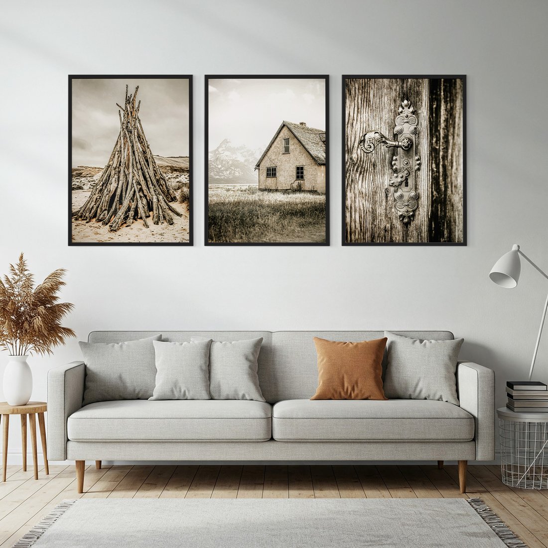 Zestaw obrazy w ramie, plakaty - vintage, dom, drewno - rama czarna