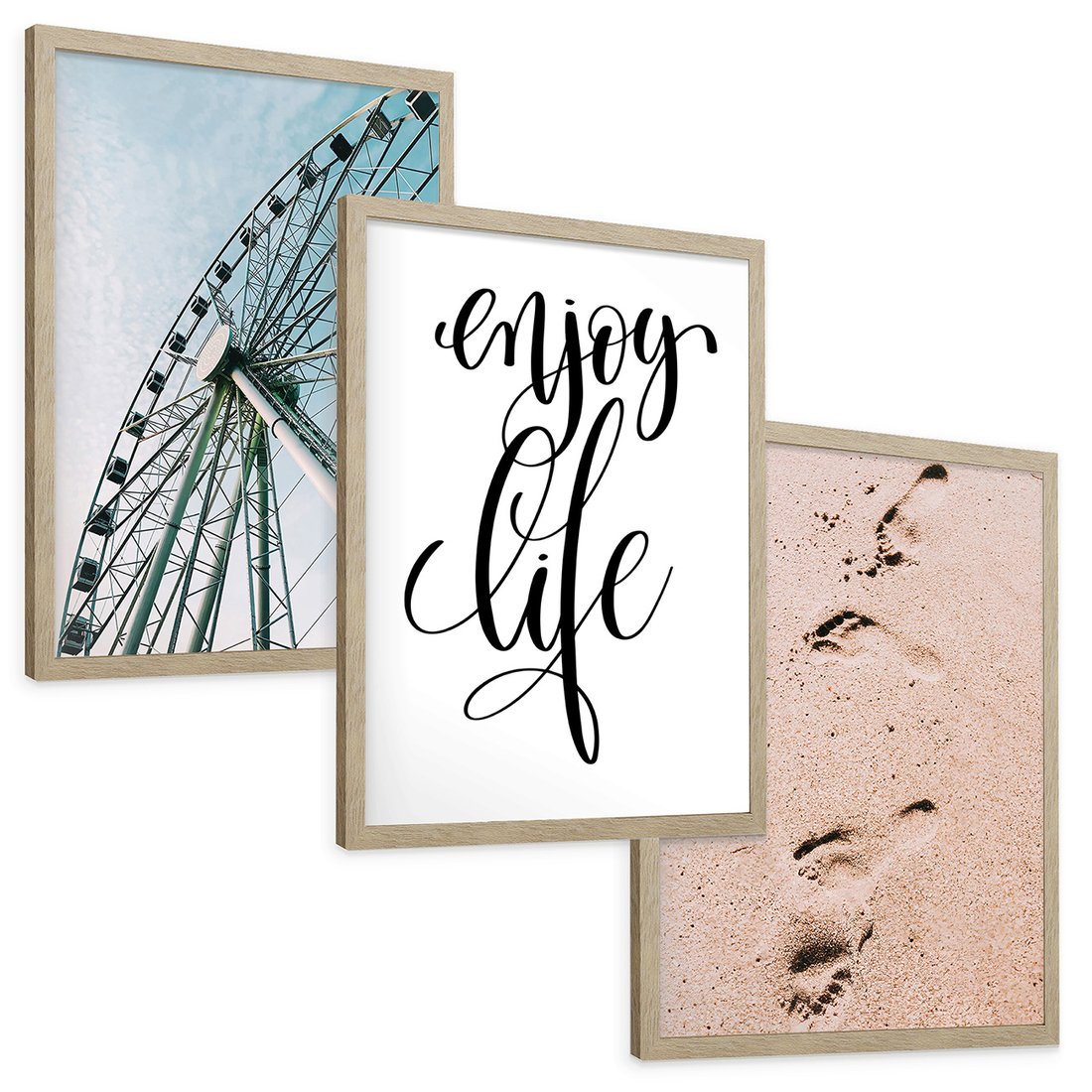 Zestaw obrazy w ramie, plakaty - wakacje, plaża, piasek - rama drewno