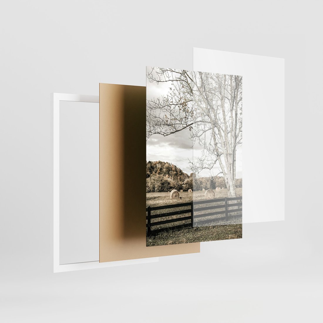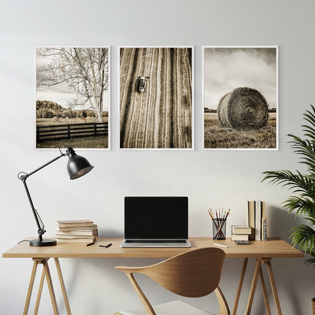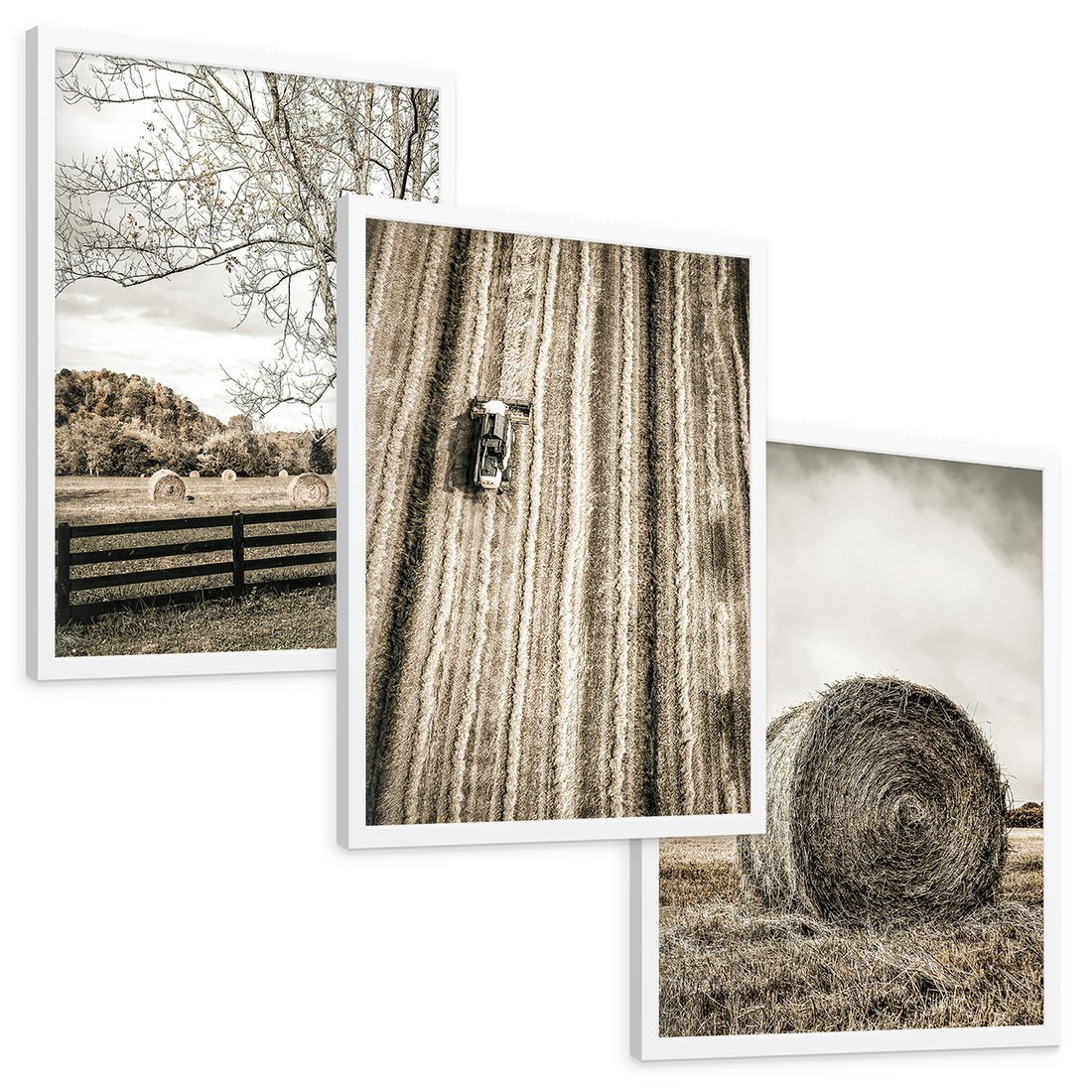Zestaw obrazy w ramie, plakaty - wieś, pole, siano, - rama biała