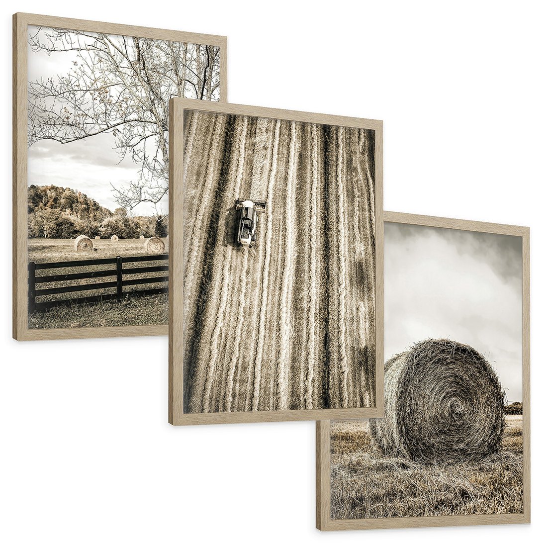 Zestaw obrazy w ramie, plakaty - wieś, pole, siano, - rama drewno