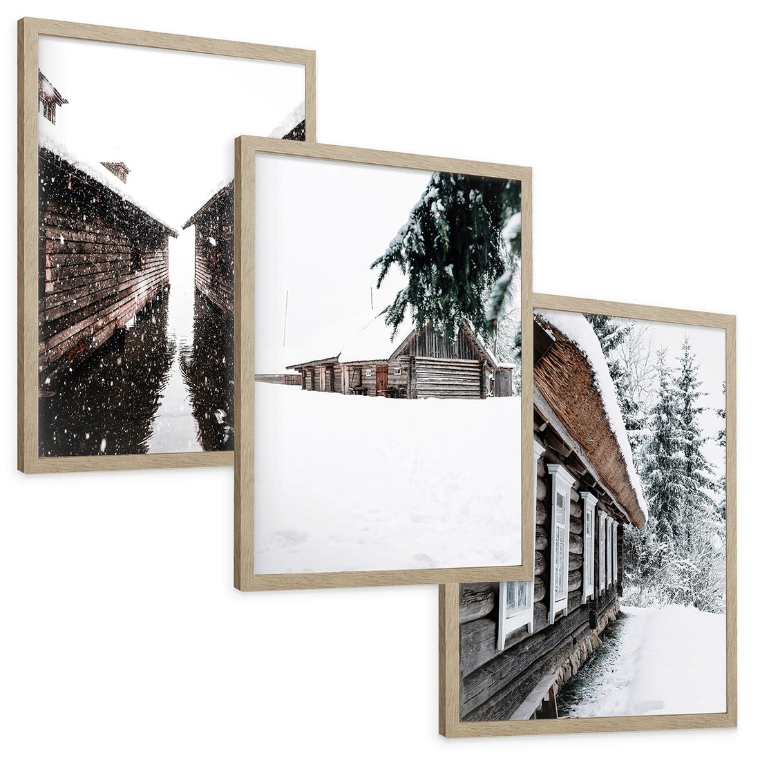 Zestaw obrazy w ramie, plakaty - zima, śnieg, budynki - rama drewno