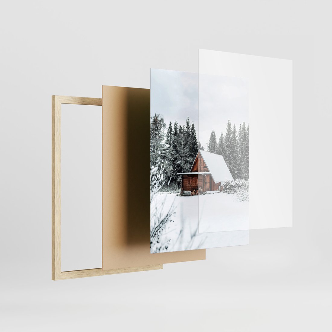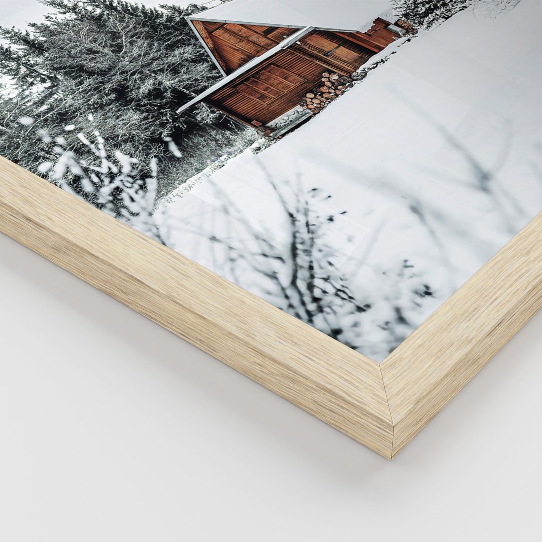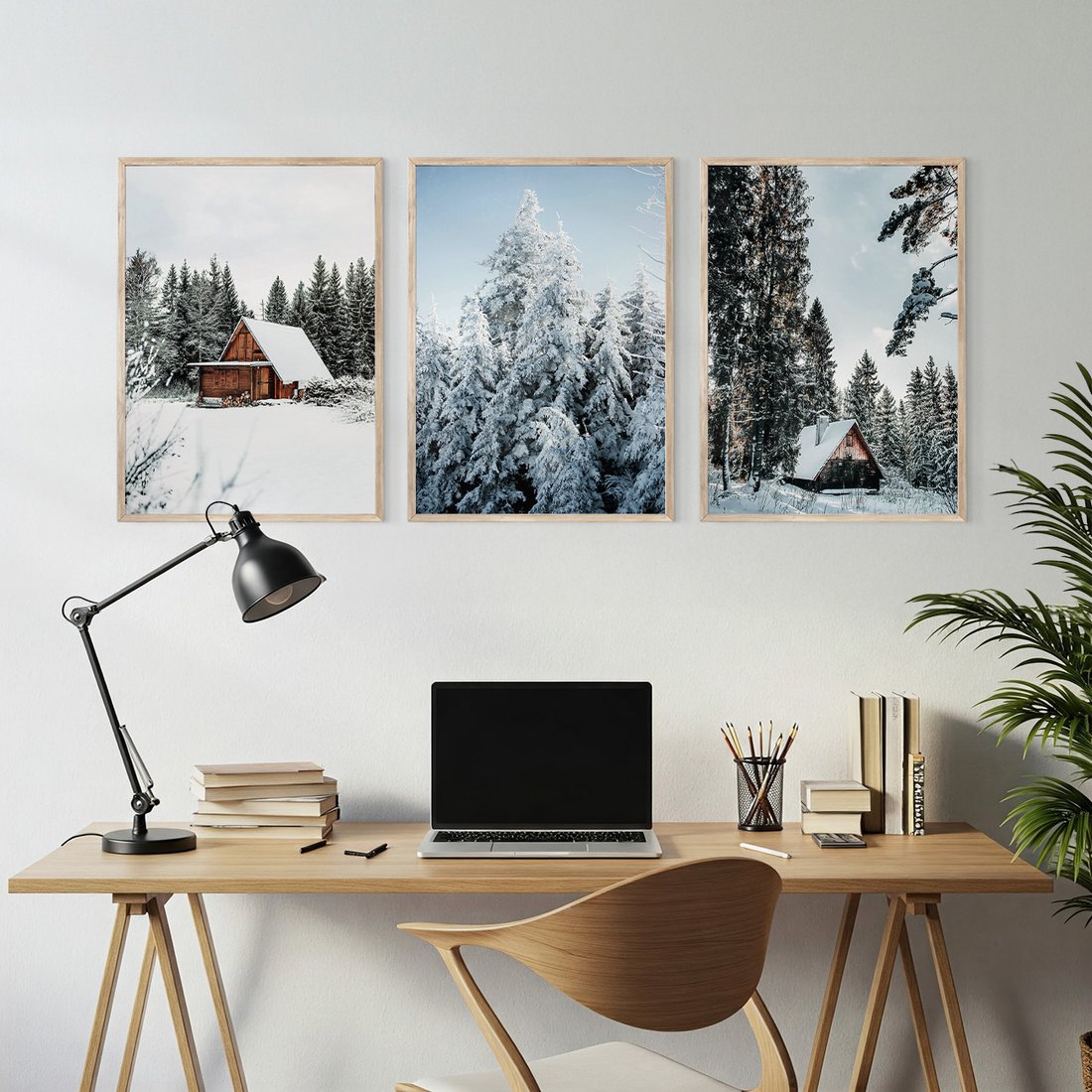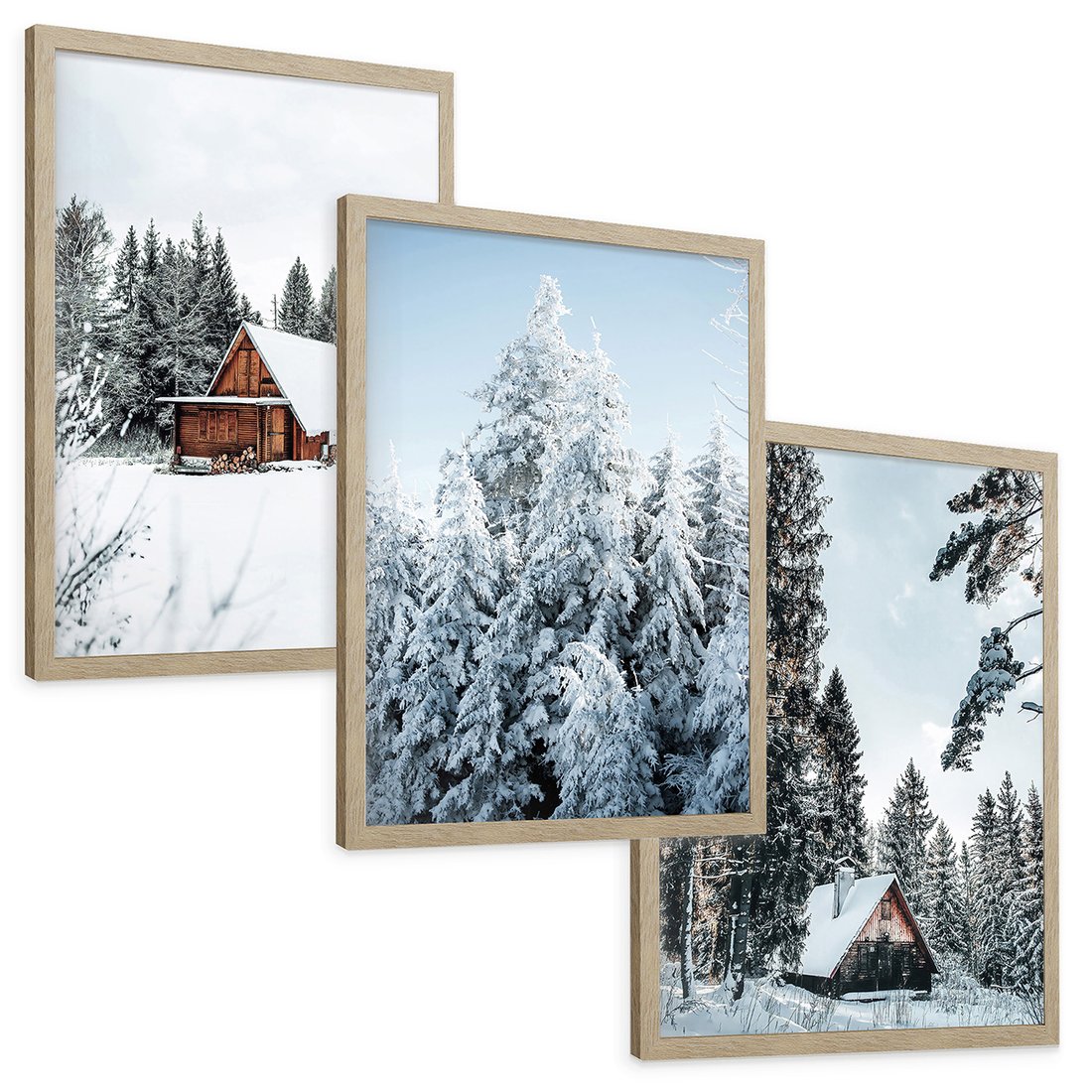 Zestaw obrazy w ramie, plakaty - zima, śnieg, drzewa - rama drewno