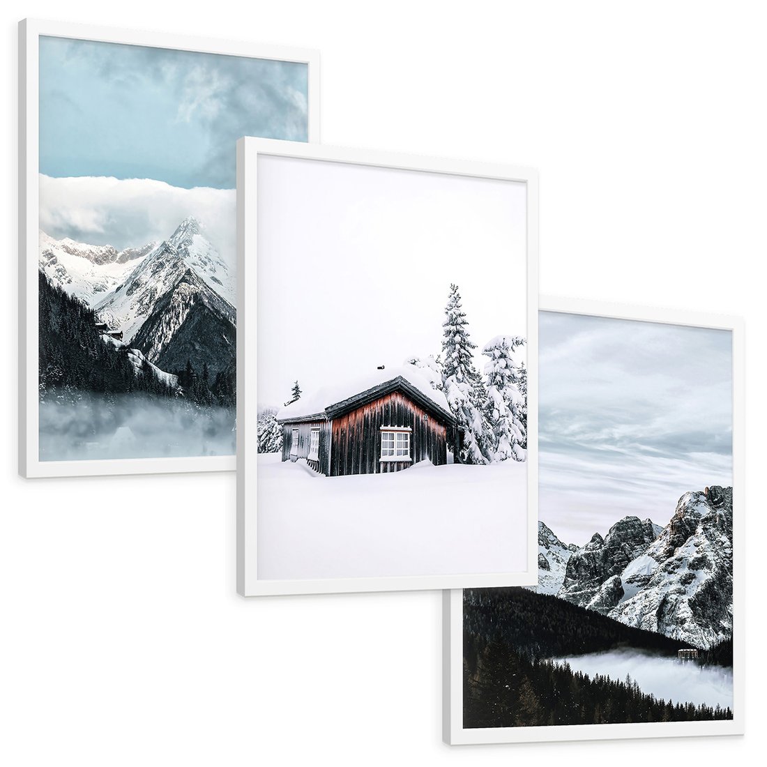 Zestaw obrazy w ramie, plakaty - zima, śnieg, góry - rama biała
