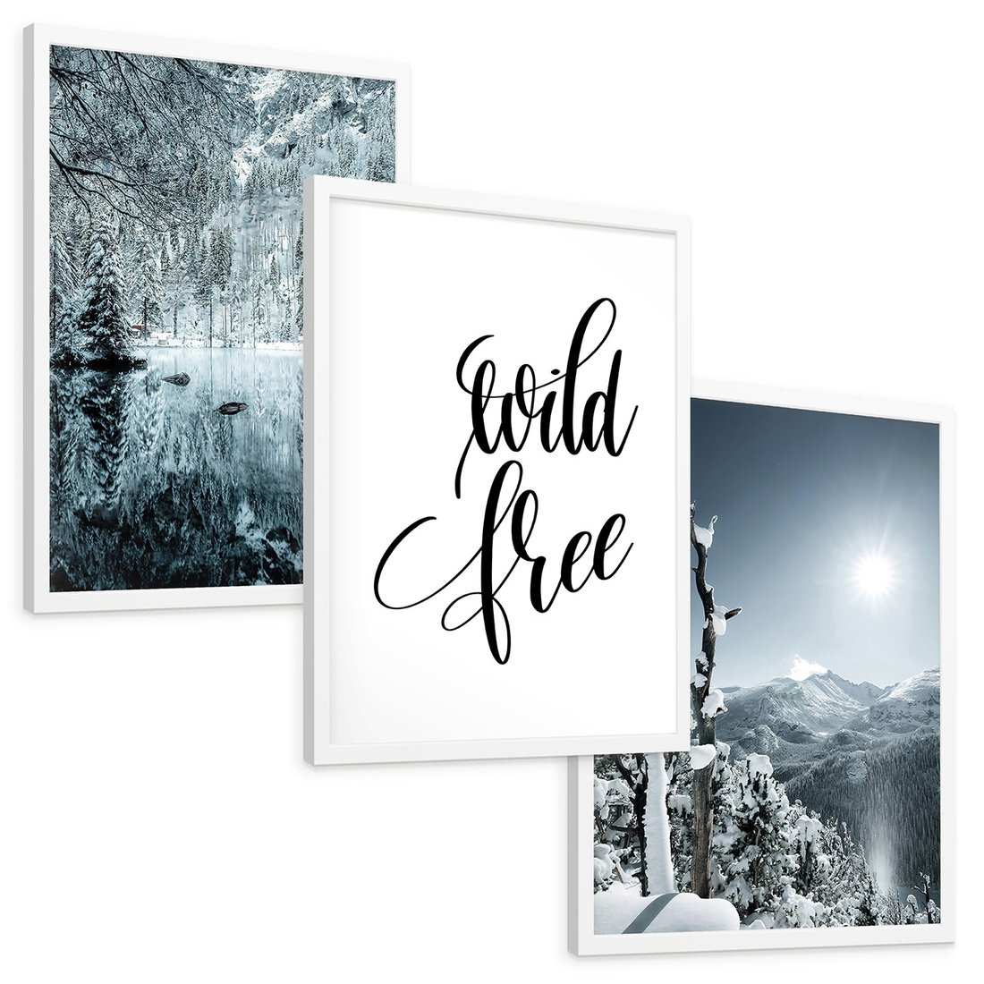 Zestaw obrazy w ramie, plakaty - zima, śnieg, góry - rama biała