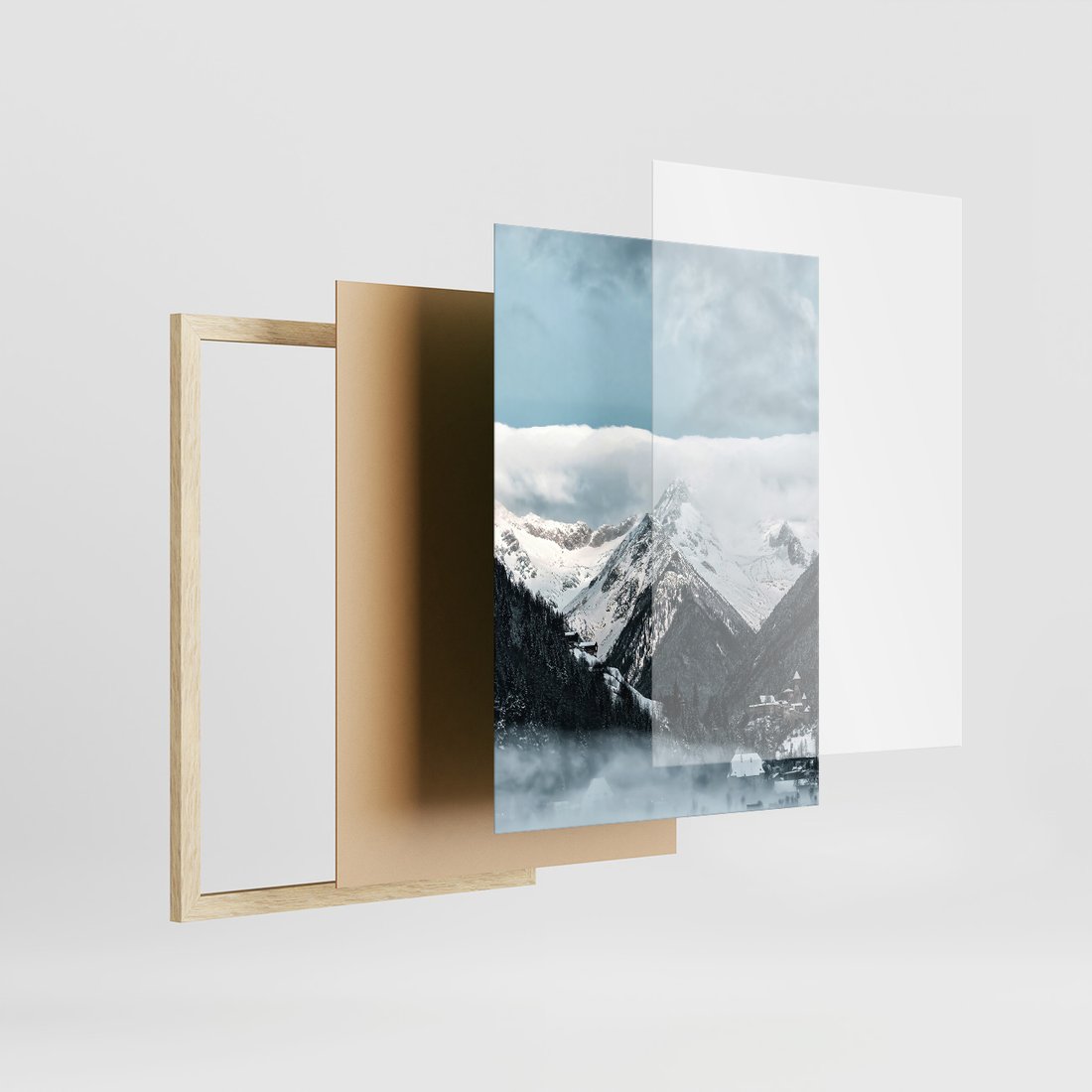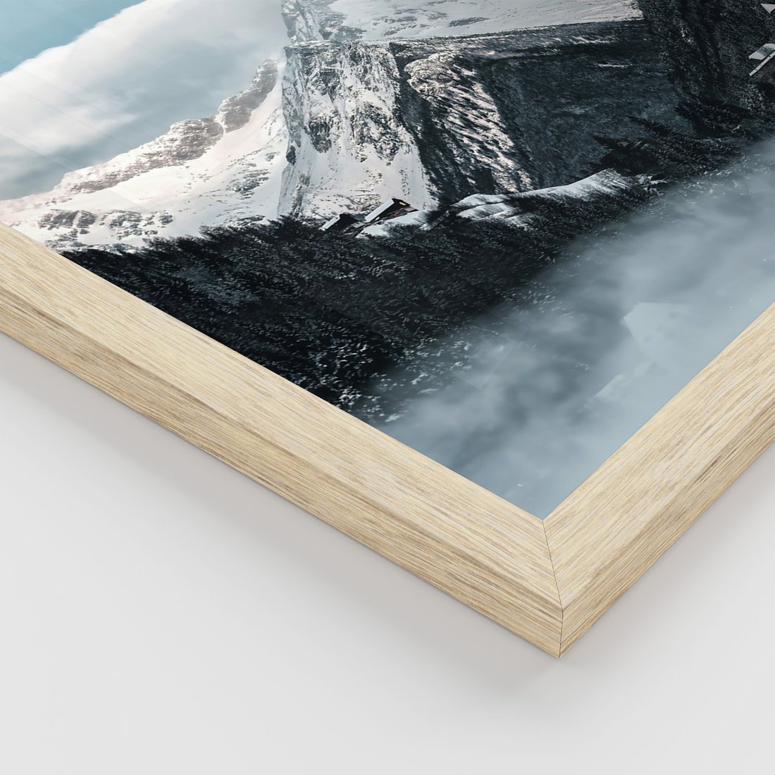 Zestaw obrazy w ramie, plakaty - zima, śnieg, góry - rama drewno