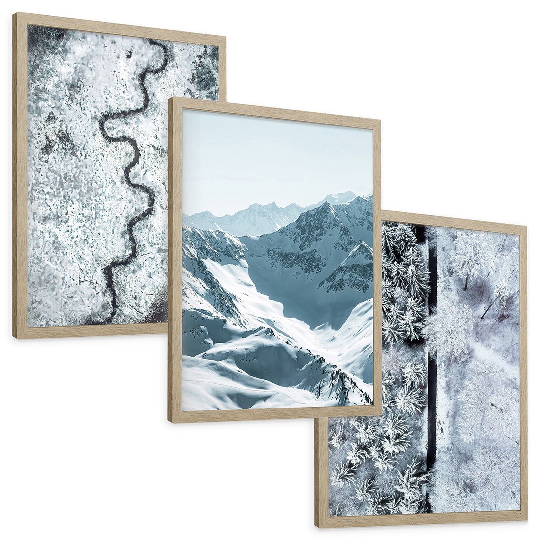 Zestaw obrazy w ramie, plakaty - zima, śnieg, góry - rama drewno