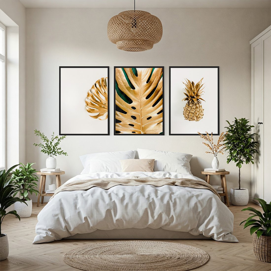 • Zestaw obrazy w ramie, plakaty - złoty, liść, ananas
