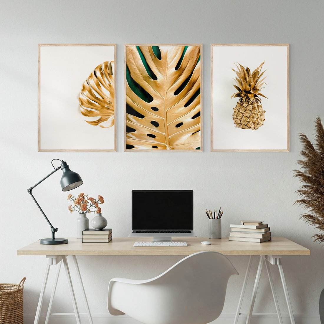 Zestaw obrazy w ramie, plakaty - złoty, liść, ananas - rama drewno