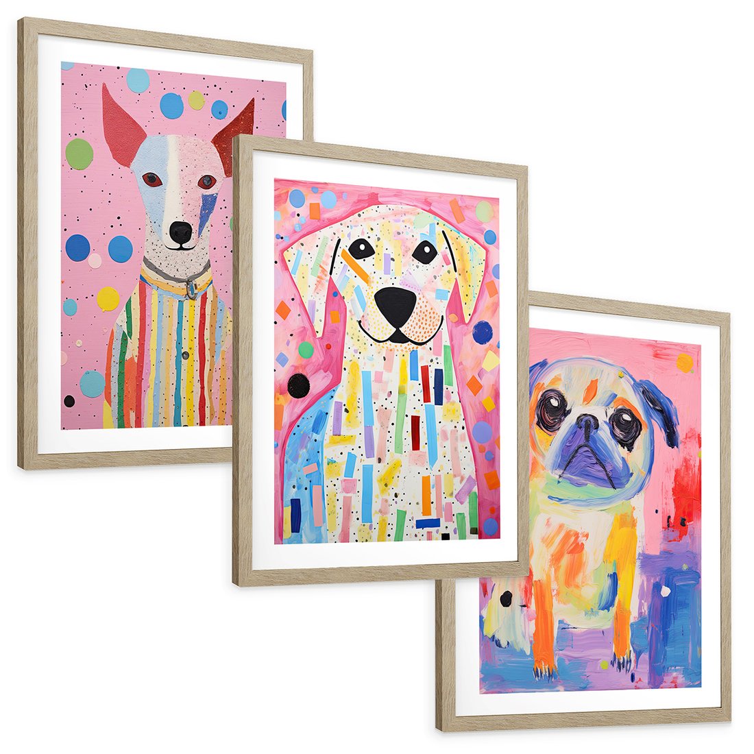 Zestaw obrazy w ramie, plakaty - zwierzęta, psy, kolorowe - rama drewno